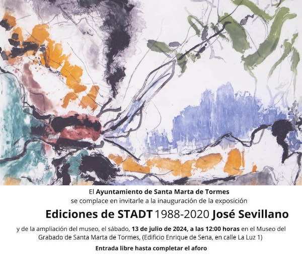 Este sábado 13 de julio de 2024, a las 12,30 horas, se inaugura en la sede del Museo del Grabado de Santa Marta de Tormes (Salamanca) —edificio Enrique de Sena, situado en la Calle de la Luz nº 1— la exposición “Ediciones de STADT 1988-2020, José Sevillano”. Se trata de un proyecto de cooperación entre el Museo del Grabado de Santa Marta (Ayuntamiento de Santa Marta de Tormes), dirigido por el artista plástico y grabador José Fuentes Esteve, y el departamento de Arte y Exposiciones del Instituto Leonés de Cultura ILC (Diputación de León), dirigido por Luis García Martínez.