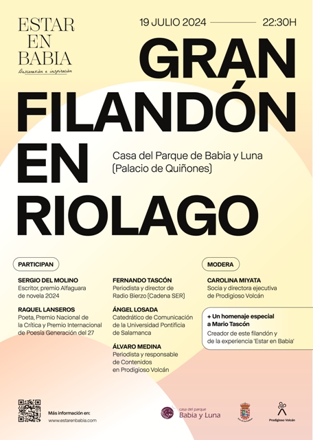 El Gran filandón en Riolago (León), organizado por la consultora de comunicación Prodigioso Volcán y el Ayuntamiento de San Emiliano, tendrá lugar este viernes 19 de julio a las 22:30 horas en la Casa del Parque de Babia y Luna (Palacio de Quiñones). Participarán la poeta Raquel Lanseros y el escritor Sergio del Molino, entre otros. Además, se rendirá homenaje al periodista y escritor berciano Mario Tascón, impulsor de esta iniciativa. El acceso es libre y gratuito.