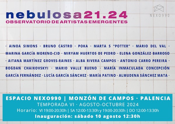 Espacio Nexo990 acaba de inaugurar, en las instalaciones del antiguo matadero de Monzón de Campos (Palencia), la muestra ‘NEBULOSA21.24. Observatorio de artistas emergentes’, un nuevo proyecto que completará hasta el 27 de octubre su sexta temporada de exposiciones. La propuesta nace con vocación de continuidad ante la escasa atención institucional al arte emergente en la Comunidad de Castilla y León.
