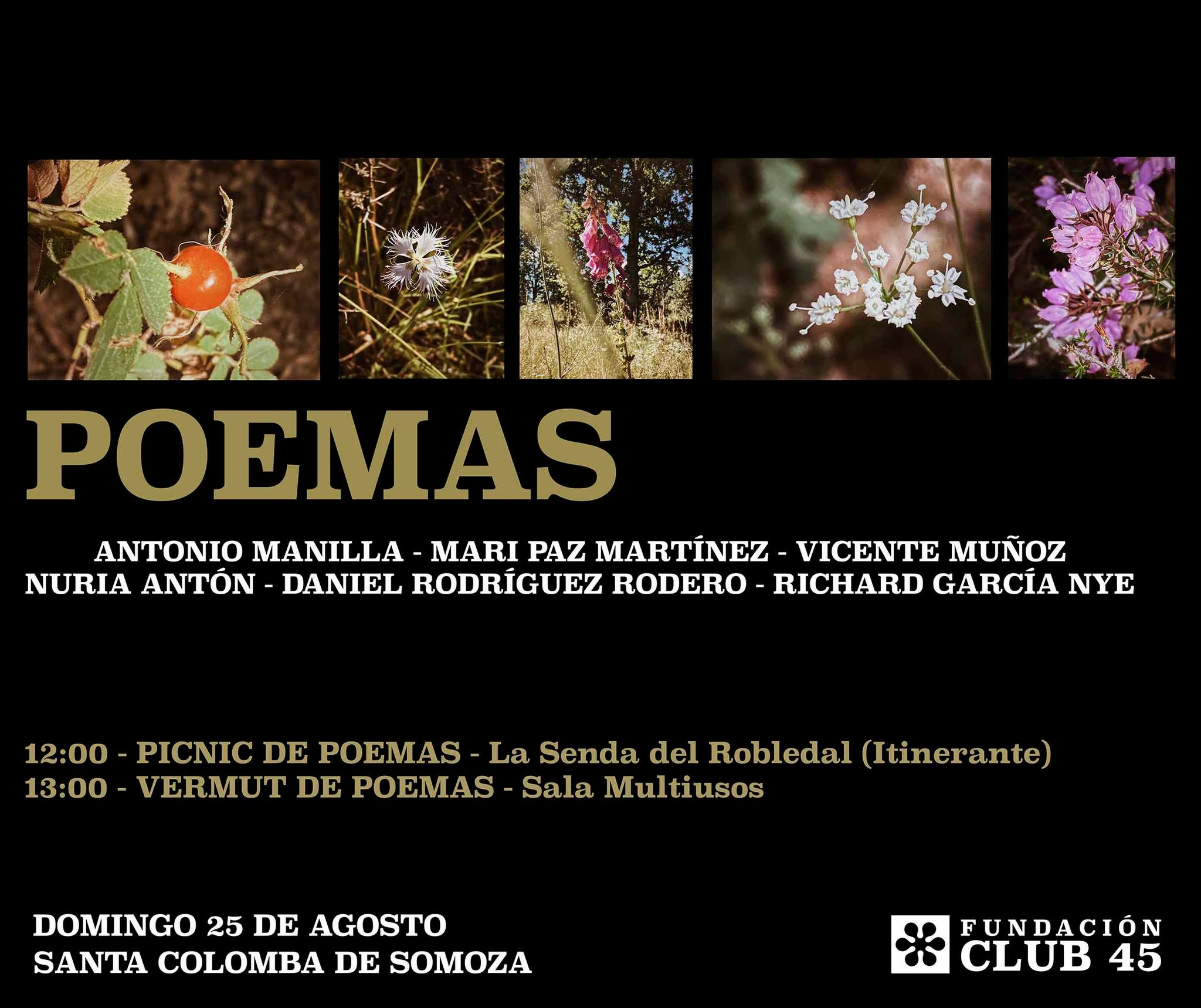 La música y los versos confluyen este fin de semana en la localidad maragata de Santa Colomba de Somoza (León), con la Fundación Club 45. Su programación incluye para el sábado 24 de agosto la fiesta Mondo Sonoro con los principales Dj’s de la escena indie rock del Noroeste; y el domingo 25, un encuentro con seis poetas que llenaran de versos y huellas la senda del robledal: Nuria Antón, Richard García, Mari Paz Martínez, Antonio Manilla, Vicente Muñoz y Daniel Rodríguez Rodero. La entrada es libre hasta completar el aforo.