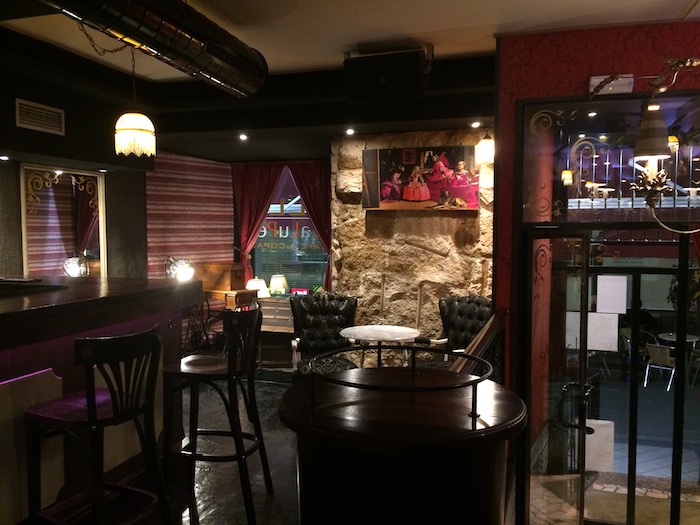 El ambiente aún muy iluminado y con pocas personas me permitió observar el alto espacio con decorado absolutamente ecléctico, mezcla decadente de modernidad, clasicismo y caricaturesco barroco. Ya en el recinto, me senté cerca de la entrada en altos bancos de la barra, solicitando al bar ténder la oportuna bebida.