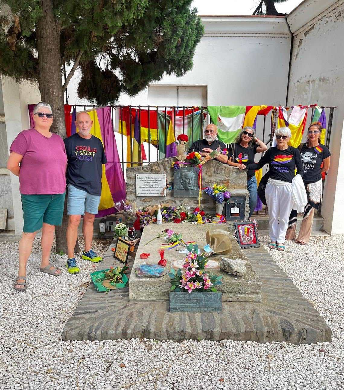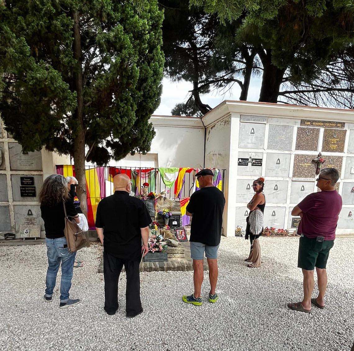 De pronto, allí, en un sitio privilegiado, en la calle central de una necrópolis renovada, estaba la tumba del llorado poeta de la generación del 98. Manolo, Chusa y Josema con sus recuerdos y descripciones generaron una emoción contenida que nos unía como una piña al resto del grupo: Carmen Lozano, Begoña Tabarés, Lola Merino y quien escribe estas líneas. En silencio, éramos perfectos receptores de tanta agitación interna. Sobre la lápida, depositamos una camiseta del conjunto de St. Pauli, equipo alemán antifascista, personalizada con la bandera republicana, firmada tanto por los presentes como por los compañeros que no pudieron desplazarse.