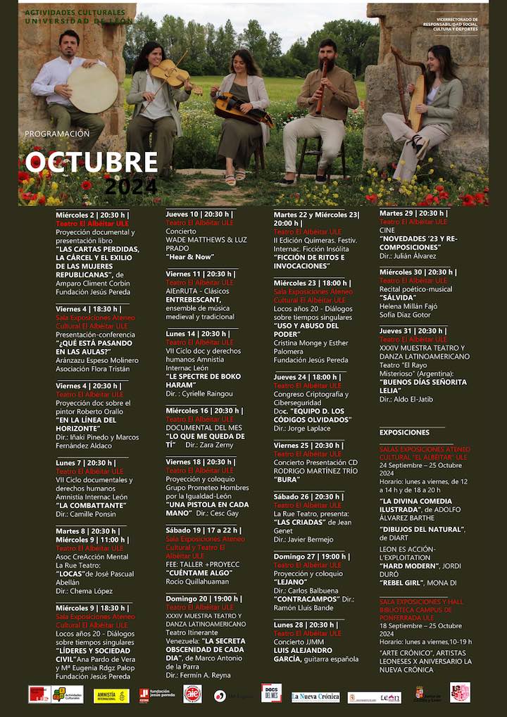 Y aquí está el cartel con el programa del Servicio de Actividades Culturales de la Universidad de León para demostrarlo. Documentales, cine, teatro, exposiciones, conciertos, debates, talleres… Las actividades, en su mayoría gratuitas, están abiertas a todos los ciudadanos y ciudadanas, no solo a los universitarios (si bien estos disfrutan de un 50% de descuento cuando hay que pagar entrada).