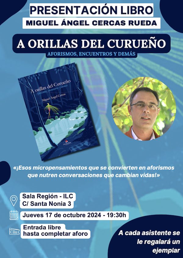 Este jueves 17 de octubre, a las 19:30 horas, el escritor y asesor financiero Miguel Ángel Cercas Rueda presentará en la Sala Región del ILC (C/Santa Nonia 3) su tercer libro de aforismos: ‘A orillas del Curueño. Aforismos, encuentros y demás’. La entrada es libre y se regalará un ejemplar a cada asistente.