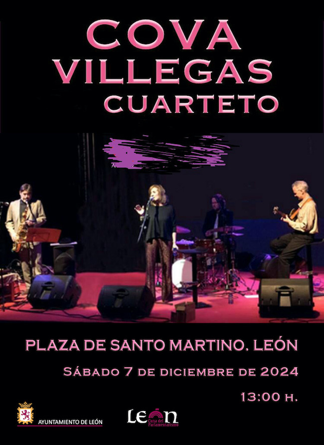 El Cuarteto Cova Villegas estará el sábado 7 de diciembre, a las 13 horas, en la leonesa Plaza de Santo Martino, tocando al aire libre y «amenizando el vermú». Con Cy Williams (guitarra), Ildefonso Rodríguez (saxo tenor), Diego Gutiérrez (batería) y Cova Villegas (voz).
