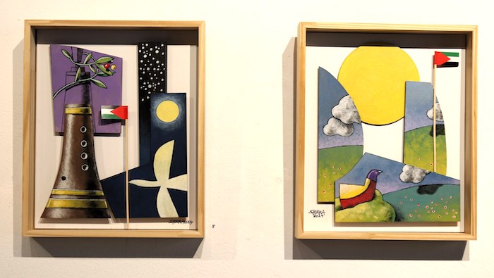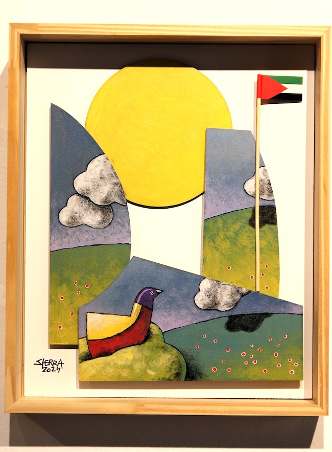 Al acercarte a las pinturas, enhiestos puntales llaman la atención del observador como si fueran los palos de un velero que rematan en lo más alto con un estandarte. Esa bandera la componen tres franjas horizontales (negro, blanco y verde) unidas con un triángulo rojo en el borde más próximo al mástil. El diálogo entre las cuatro tonalidades, a estas alturas de la película lo sabe ya todo el mundo, es la bandera de Palestina. Y ahí Manuel Sierra, sospecho, ha querido que detengamos nuestra mirada –pasada, presente y futura- con un mensaje que es “algo parecido a lo que les sigue pasando a los miles de gazatíes, aún vivos, queriendo y no pudiendo reconstruir sus vidas, sus trabajos, sus casas y sus huertos. Su memoria destruida por los bombardeos israelíes en esta guerra de aniquilación, en este asesinato colectivo”. Esa enseña, reproducida por Sierra, es la insignia que reconocen la ONU y la UNESCO, pero, ¿cómo es posible?, no el estado de Israel.