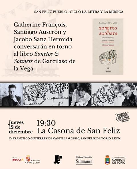 Catherine Francois y Santiago Auserón estarán acompañados por el catedrático de literatura y director del servicio de publicaciones de la Universidad de Salamanca Jacobo Sanz Hermida y dialogarán en torno a los sonetos de Garcilaso de La Vega, de una magnifica edición que han llevado a cabo desde Ediciones de la Universidad de Salamanca.