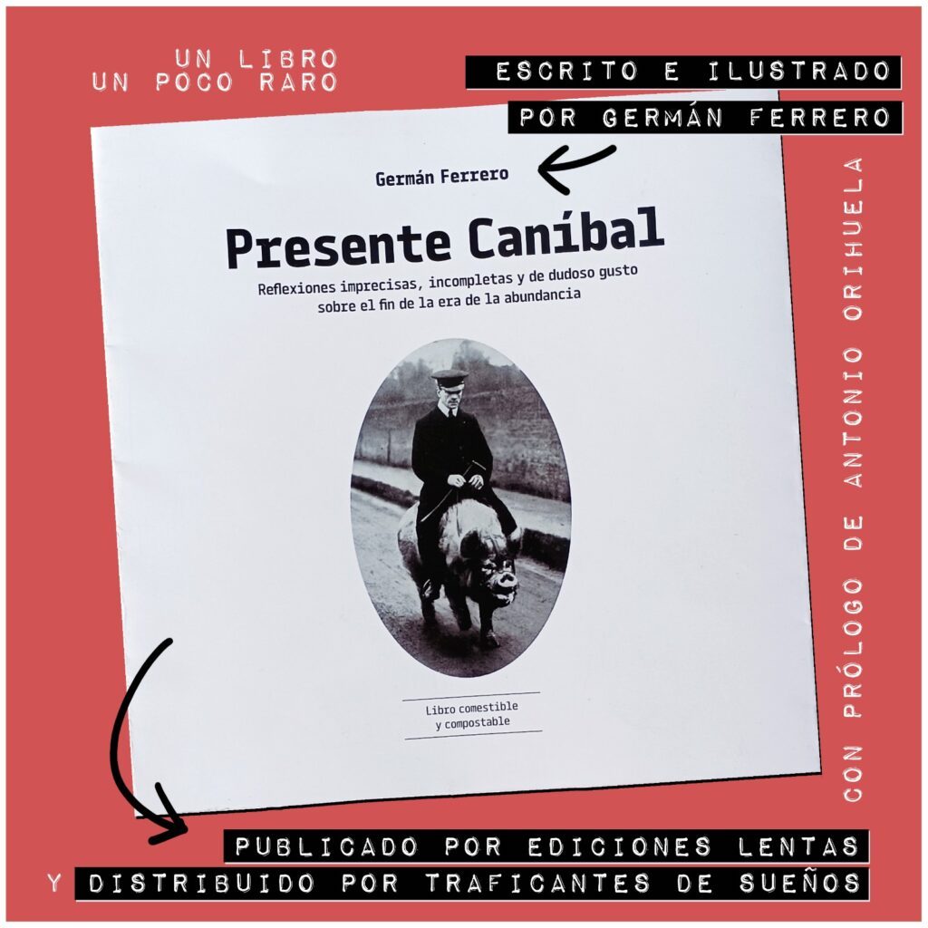 «Presente Caníbal. Reflexiones imprecisas, incompletas y de dudoso gusto sobre el fin de la era de la abundancia». Así se titula el primer libro del ilustrador y profesor de economía leonés Germán Ferrero, alma y voz del grupo leonés La Jari. Y sí, es un libro un poco raro… a la vez que crítico y físicamente hermoso, en el que el autor conjuga de alguna manera todas sus facetas.