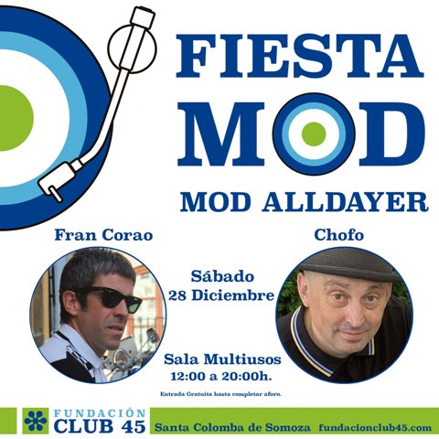 Desde el pasado mes de junio que abrió sus puertas, la Fundación Club 45 no ha cesado en ofrecer numerosas actividades cada fin de semana: conciertos, presentaciones, charlas, pinchadas, inauguraciones y talleres, relacionadas con la Cultura Pop. Este último del año no podía ser menos y llega con llega con mucha música, como la fiesta mod propuesta por los dj’s asturianos Fran Corao y Chofo para este sábado en la que desplegarán su arsenal de discos de vinilo a 45 revoluciones por minuto. Ambos, viejos conocidos de la escena sixties nacional, organizan de manera habitual eventos y fiestas en su ciudad. Son apasionados del soul y de los grupos beat de los años sesenta pero también cultivan otros sonidos como el rhythm’n’blues o el revival mod. Como curiosidad, señala el responsable de la Fundación Club 45 Álex Cooper, que “Fran Corao era el batería de Los Reactores, una banda asturiana que teloneó a Los Flechazos en la primerísima edición del Purple Weekend, en un concierto que tuvo lugar en el “Toisón” mítica sala de la capital”.