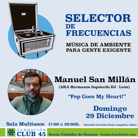 La música continúa el domingo con el leonés Manuel San Millán en el ciclo “Selector de Frecuencias”, en el que se podrá disfrutar de la recopilación de canciones que algunos de los más importantes coleccionistas de discos de nuestro entorno eligen para compartir en sesiones. San Millán ya ha visitado la Fundación en otras ocasiones, aunque es la primera vez que pincha aquí. “Su gusto es exquisito a la hora de combinar canciones emblemáticas de la escena indie con temas menos conocidos de grupos alternativos de América e Inglaterra. Y, además de la técnica a la hora de mezclar, el factor emocional juega un importante papel porque sus sesiones son para escuchar con el corazón”.