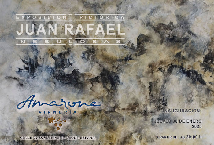 Este jueves 30 de enero de 2025, a partir de las 20 horas, se inaugura «Nebulosas», una exposición del pintor leonés Juan Rafael, en la Vinnería Amarone (C/ Cascalerías 3, León). Se podrá visitar durante un mes, hasta el próximo 27 de febrero.