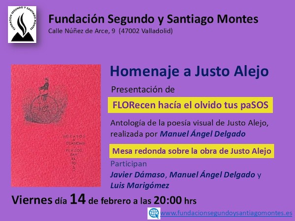 Poeta tan intenso como prolífico, Justo Alejo escribió poesía en todas sus variedades, también en la experimental y visual. Un ejemplo de su poesía visual es la Antología realizada por Manuel Ángel Delgado, titulada FLOrecen hacia el olvido tus paSOS, editada por la Universidad de León, que se presentará en este acto.