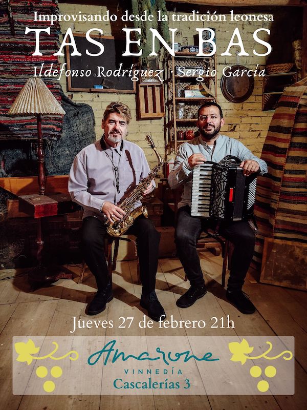 Tas en Bas, el dúo formado por Sergio García e Ildefonso Rodríguez, ofrecerá un concierto este jueves 27 de febrero, a las 21 horas, en la Vinnería Amarone (C/ Cascalerías 3, León), coincidiendo con la clausura de la exposición «Nebulosas», del pintor leonés Juan Rafael.