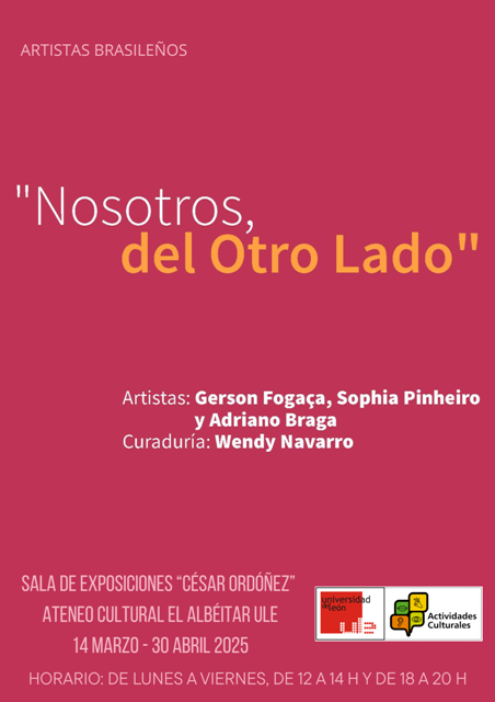 Hasta el 30 de abril la Sala de Exposiciones del Ateneo Cultural El Albéitar (ULE) alberga la colectiva “Nosotros, del otro lado”, en la que participan tres artistas brasileños: Sophia Pinheiro, Gerson Fogaça y Adriano Braga, con más de una veintena de obras. Se puede visitar de 12:00 a 14:00 horas y de 18:00 a 20:00 horas.