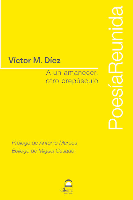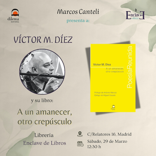 El próximo jueves 27 de marzo, a las 20.30 horas, en el Teatro El Albéitar de la Universidad de León, el poeta Víctor M. Díez presentará el libro A un amanecer, otro crepúsculo (Editorial Dilema), su poesía reunida, con un espectáculo poético y musical en el que estará acompañado por grupos y músicos señeros en su trayectoria: Sin Red, Angela Davis y Rodrigo Martínez. Junto al autor estará, además, el periodista Antonio Marcos, prologuista del libro. // Entradas: 5€ (3€ para la comunidad universitaria). A las personas interesadas en adquirir el libro, se les descontará el precio de la entrada, entregando la misma al finalizar el acto.