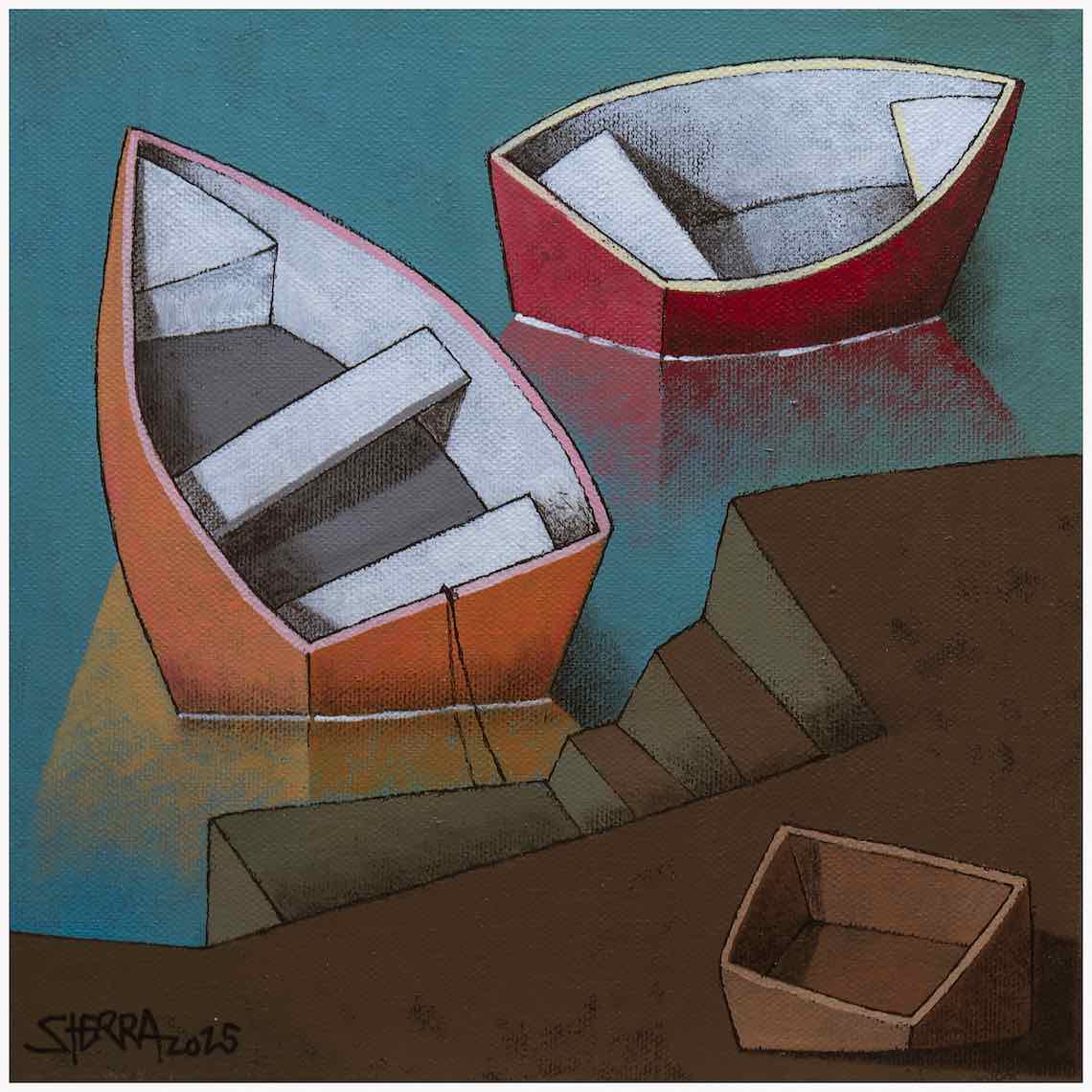 “Barcas del puerto de Corme” recoge, como en casi todas las exposiciones de Sierra, “una mirada ligada a lo cercano, a lo que tienes al lado, un homenaje a las cosas cotidianas, a las tareas sencillas de la existencia, a los objetos que te rodean”, reitera.