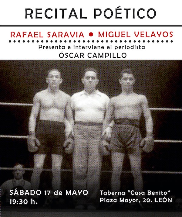 Este sábado 17 de mayo, a las 19:30 horas, la histórica taberna Casa Benito, en la Plaza Mayor de León, acogerá un recital de los poetas Miguel Velayos y Rafael Saravia. Actuará como presentador e intervendrá en el acto el periodista Óscar Campillo.