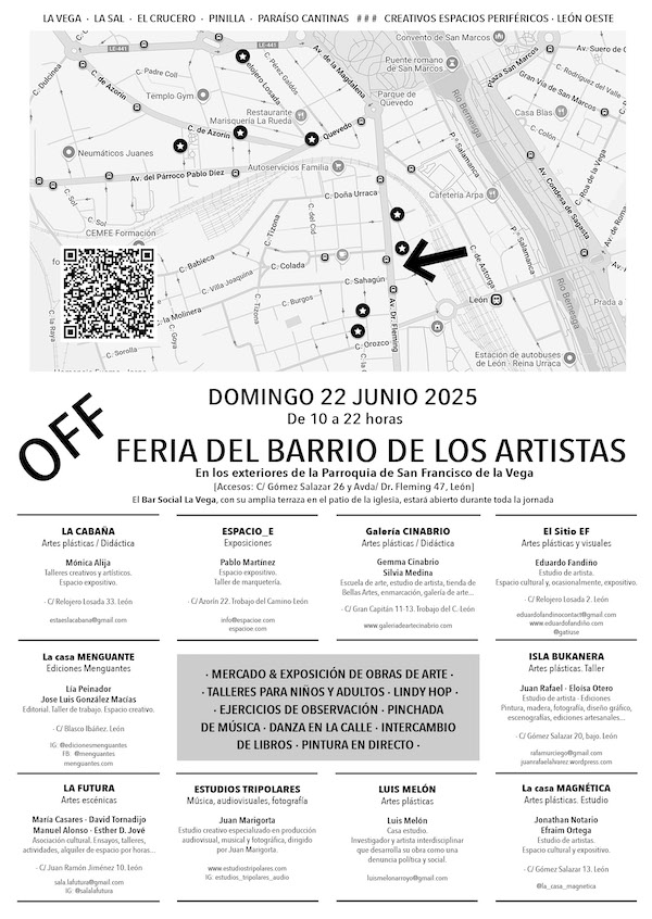 OFF Feria del Barrio de los Artistas tiene como objetivo visibilizar el trabajo de los creadores multidisciplinares que tienen su sede artística al otro lado del río Bernesga y de las vías ferroviarias (León Oeste), dinamizar la vida artística y cultural del extrarradio y poner en valor la periferia leonesa, donde se aglutina un rico mosaico multiétnico y cultural.