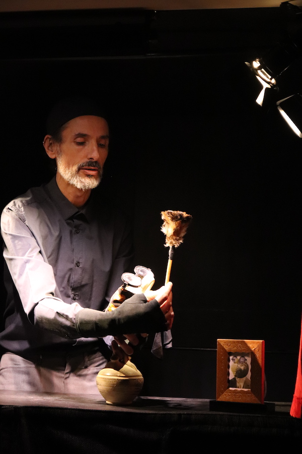 Por fin, teloncito rojo, cerrado en ese momento, se abrió y… entró la magia a la sala. En el centro del proscenio, dos pequeños botijos de cerámica blanca, unas pequeñas gafas, un trocito de tela, un minúsculo plumero y un actor, vestido de negro y con guantes sin dedos.