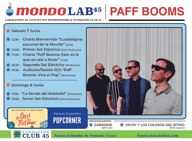 Este fin de semana, 7 y 8 de junio, la Fundación Club 45 retoma su Laboratorio de Cultura Pop con la visita de los Paff Booms, un explosivo conjunto pop que llega a Santa Colomba de Somoza, en la Maragatería leonesa, desde Azuqueca de Henares, Guadalajara.