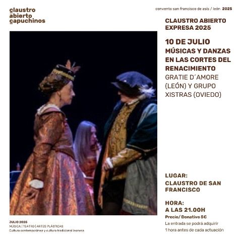 Los grupos Xistras (León) y Gratie D’Amore (Oviedo) son los protagonistas de “Músicas y Danzas en las Cortes del Renacimiento”, un espectáculo de música y danza histórica que representarán este jueves 10 de julio en el Claustro de San Francisco, dentro de la programación del ciclo Claustro Abierto Capuchinos. Dará comienzo a las 21:00 horas. La entrada se podrá adquirir una hora antes de cada actuación con un precio/ donativo de cinco euros.
