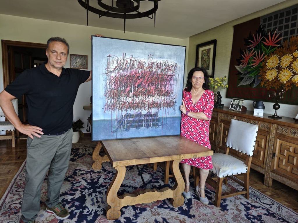 Aunque resulte muy difícil descifrar la letra inscrita en el lienzo (por algo es un «palimpsesto»), Antonia Matías sabe que se trata de versos de Antonio Gamoneda, y precisamente por eso escogió este cuadro en concreto para la donación, «ya que Gamoneda y Pereira fueron grandísimos amigos».