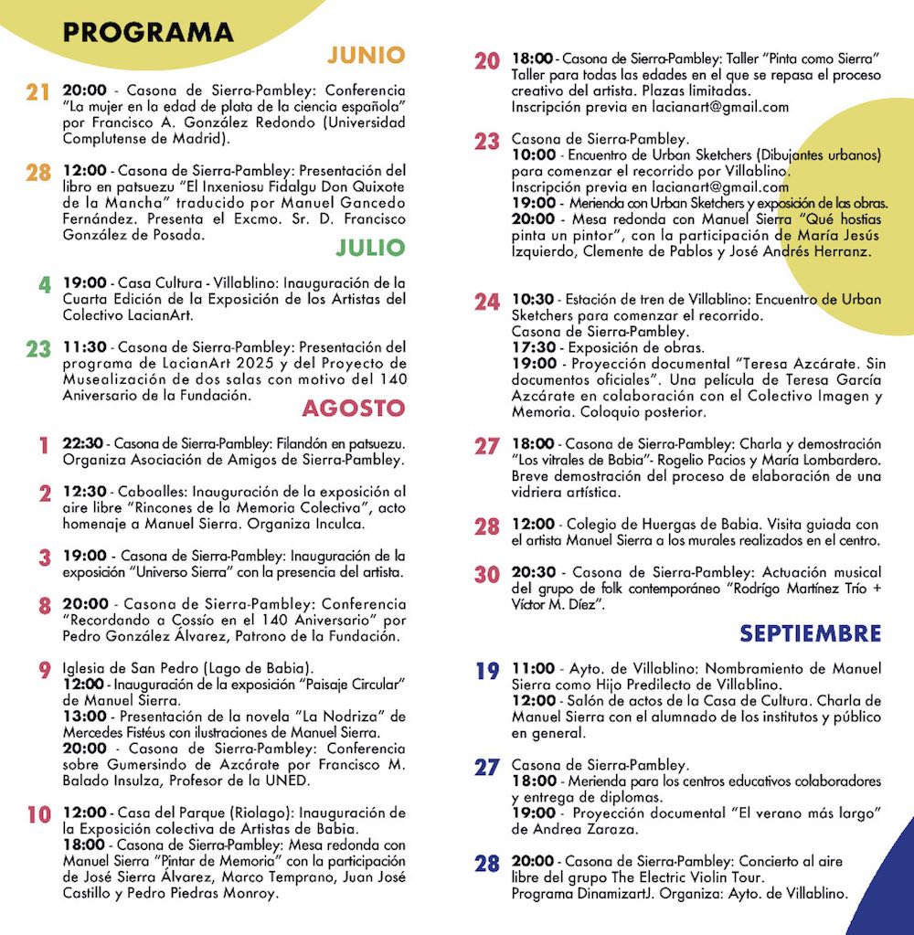 La variada programación de actividades, organizada por el colectivo LacianArt en colaboración con la Fundación Sierra Pambley y el Ayuntamiento de Villablino, se centra en exposiciones del colectivo LacianArt y artistas de Babia, muestras del trabajo de Sierra en iglesias, locales de hostelería, bares, cafeterías, murales en las casas del pueblo y escuelas públicas. Además, los visitantes tendrán la oportunidad de asistir a la presentación de un libro, talleres, visitas guiadas, mesas redondas, exhibiciones de fotografía, conferencias y dibujos de alumnos de media docena de centros de enseñanza.