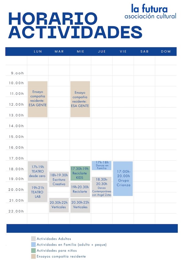Por segundo año consecutivo arrancan los talleres estables en la sala La Futura , ubicada en el Barrio de los Artistas León Oeste, en los aledaños del Palacín. Será a partir del lunes día 29 de septiembre cuando retomará su actividad este espacio versátil, para llenarse de talleres y laboratorios de teatro, danza contemporánea, danza en familia, verticales, reciclaje, escritura creativa… sin olvidar el «grupo de crianza colectiva».