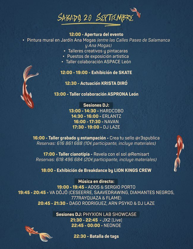 Programa sábado 19 septiembre. 17 de septiembre de 2025 Return to: «León Jam» llenará la antigua estación de Renfe de música y arte urbano durante dos díasMáxima resolución (650 × 838) Image navigation Previous Image Programa sábado 19 septiembre.