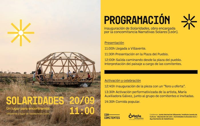 Este sábado 20 de septiembre el proyecto de arte participativo “Narrativas Solares”, mediado por Alfredo Escapa Presa de Concomitentes, inaugura “Solaridades”. Una obra diseñada por la arquitecta María Auxiliadora Gálvez que pone en el centro la relación de las personas con el sol e invita a los vecinos de la zona a encontrase en este espacio. Tendrá lugar en la localidad leonesa de Villavente, en La Sobarriba, a partir de las 12:45 horas.