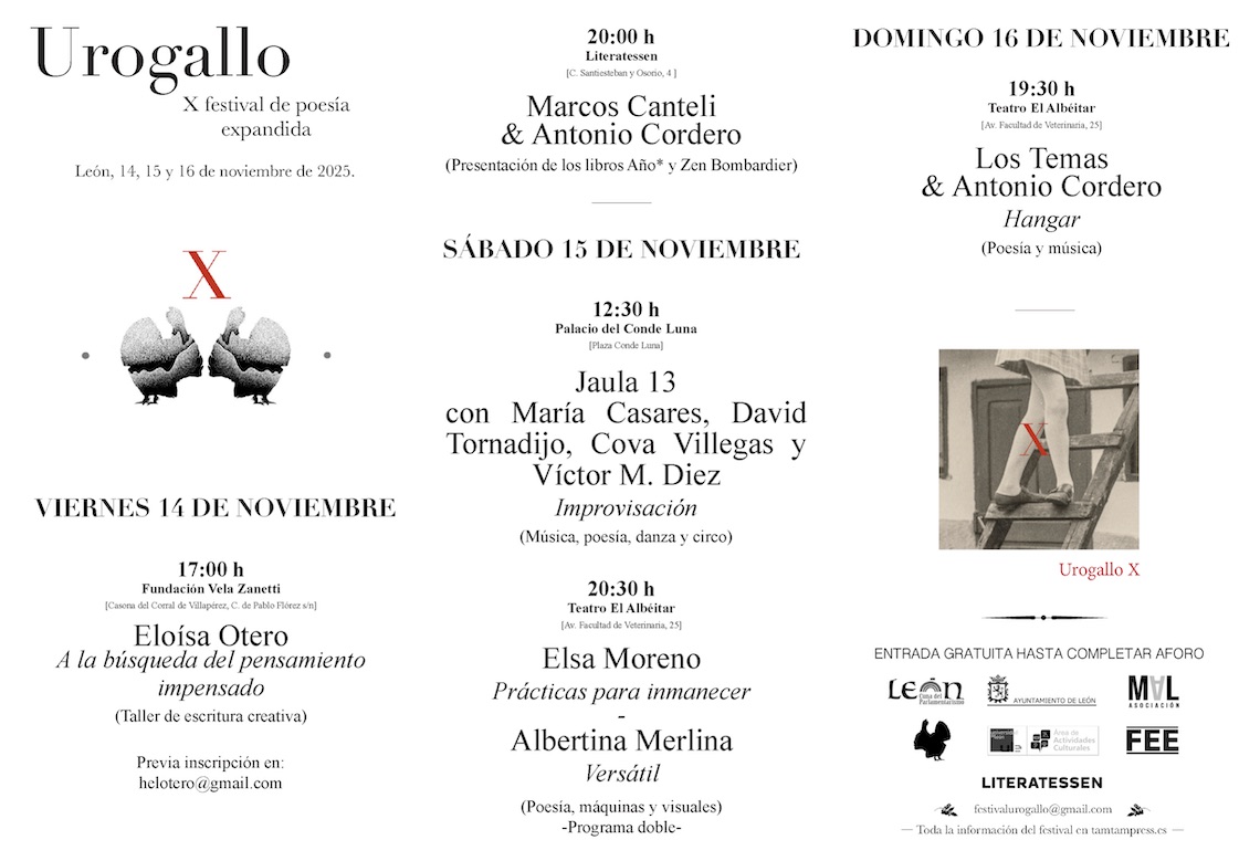 Programa X Urogallo 3 de noviembre de 2025 Return to: El Festival UROGALLO celebra diez años con tres días de poesía expandidaMáxima resolución (1140 × 779) Image navigation Previous Image Siguiente imagen