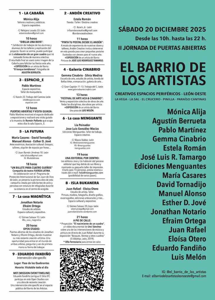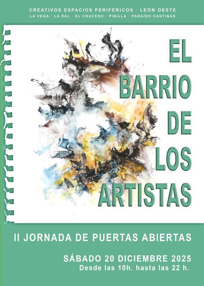 Un total de ocho espacios creativos del Barrio de los Artistas (León Oeste) volverán a abrir sus puertas este sábado 20 de diciembre de 2025, desde las diez de la mañana hasta las diez de la noche, para darse a conocer, intercambiar experiencias y dinamizar la zona. En esta II Jornada de Puertas Abiertas –la primera tuvo lugar el año pasado por estas fechas, con gran éxito de público– participarán un total de 18 creadores de distintas disciplinas, todos ellos residentes en el viejo barrio ferroviario leonés. El programa incluye exposiciones, teatro, intervenciones en la calle, performances, charlas y actividades participativas.