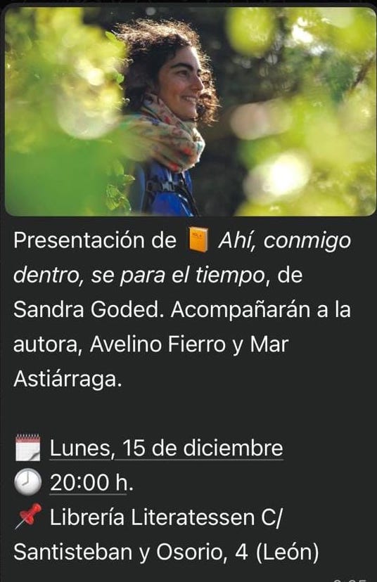 La librería leonesa Literatessen acoge este lunes 15 de diciembre, a las ocho de la tarde, la presentación del libro de poemas ‘Ahí, conmigo dentro, se para el tiempo’ (Talón de Aquiles ed.), cuya autora es la bióloga y científica gallega Sandra Goded Millán. Estará acompañada por el escritor Avelino Fierro y la fotógrafa Mar Astiárraga.