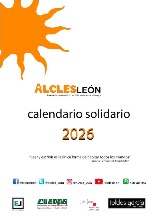 La Asociación Leonesa Con Las Enfermedades de la Sangre, ALCLES León, realiza cada año un calendario solidario con la finalidad de difundir y sensibilizar sobre las enfermedades de la sangre y la donación de medula ósea. El de 2026 se ilustra con doce fotografías, una por cada mes, de doce escritores leoneses, novelistas y poetas de distintos estilos: Susana Fernández Fernández, Ana Flecha Marco, Ángel Cabezas Amurgos, Javier Pérez Fernández, Antonio Gamoneda, Víctor M. Díez, Noemí Sabugal, Janick Le Men, Eloísa Otero, Ildefonso Rodríguez, Nuria Viuda y José María Merino.