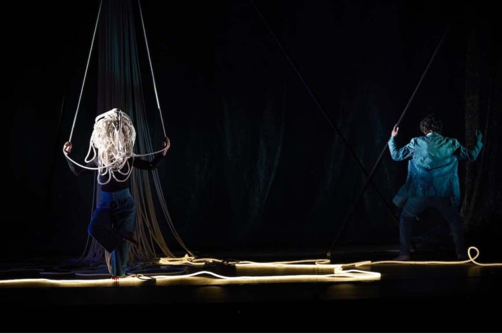 Es una casi ‘tragi’, casi, comedia que mezcla humor absurdo con drama, que se atreve a romper el tabú para hablar de la muerte. Un acto de resiliencia y un homenaje a la superación de los duelos. “Se sumerge en un mar de cuerdas como quien navega por los recuerdos. Se enfrenta a emociones en calma chicha y en fuerte marejada. ¿Cómo sobrevivir al hueco que dejan los que ya no están? No sabemos cómo. Solo que la vida pasa. A veces por soleá, otras por bulería”. Así definen desde la compañía andaluza esta pieza, en la que se diluyen los conceptos del teatro físico, el circo, la música en directo y la plástica escénica en un ritual casi humorístico, casi poético, casi flamenco y dramático.