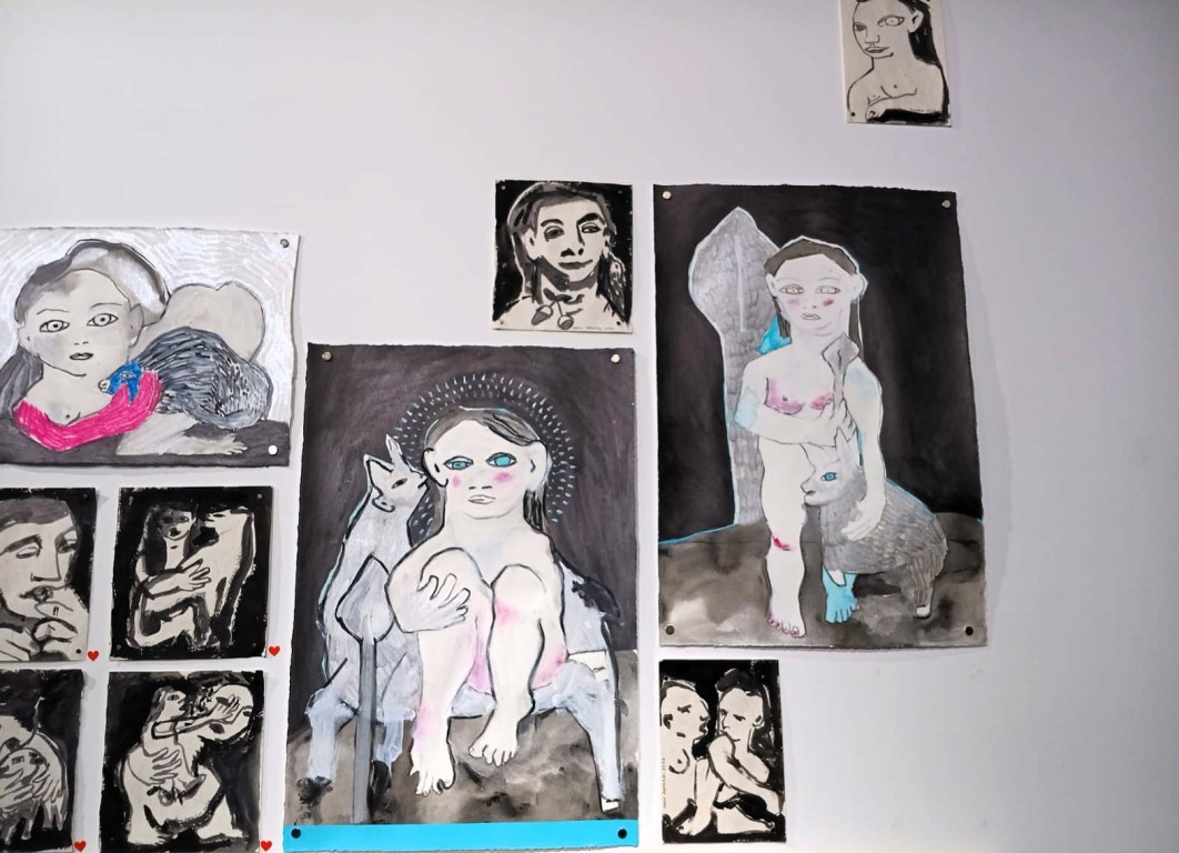 Mujeres sagradas es la obra colectiva que han creado en esta ocasión para la galería Ármaga. Está formada por doce pequeños dibujos y una obra en gran formato sobre tela, intervenida por las tres a través de un complejo proceso que Reme resume así: “Carnita borda la tela y me la envía. Yo hago el retrato de las tres y se lo devuelvo a Cathy para que finalice la pieza con sus medallas de protección”. Esta última pieza condensa su forma de trabajo, muy limitado por la distancia entre sus lugares de residencia.