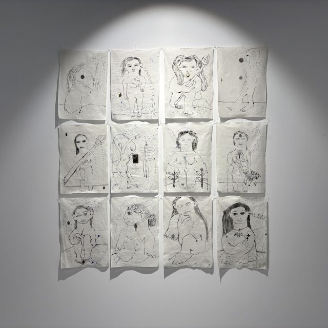 Mujeres sagradas es la obra colectiva que han creado en esta ocasión para la galería Ármaga. Está formada por doce pequeños dibujos y una obra en gran formato sobre tela, intervenida por las tres a través de un complejo proceso que Reme resume así: “Carnita borda la tela y me la envía. Yo hago el retrato de las tres y se lo devuelvo a Cathy para que finalice la pieza con sus medallas de protección”. Esta última pieza condensa su forma de trabajo, muy limitado por la distancia entre sus lugares de residencia.