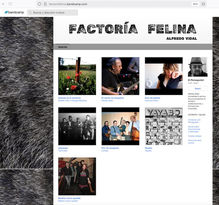 Con el título de «Banda Felina», y el sobrenombre de El Perseguidor (un guiño al cuento en el que Julio Cortázar rinde tributo al grandísimo Charlie Parker), Alfredo Vidal ha empezado a recopilar sus grabaciones más antiguas, algunos discos publicados y otros materiales inéditos, como composiciones, proyectos experimentales… en una página de Bandcamp, desde la que se puede escuchar (y descargar, compartir, insertar) todo lo que ha subido hasta el momento, y que, como un trabajo en proceso, irá creciendo a medida que se vayan rescatando, limpiando y añadiendo archivos.