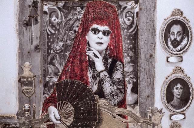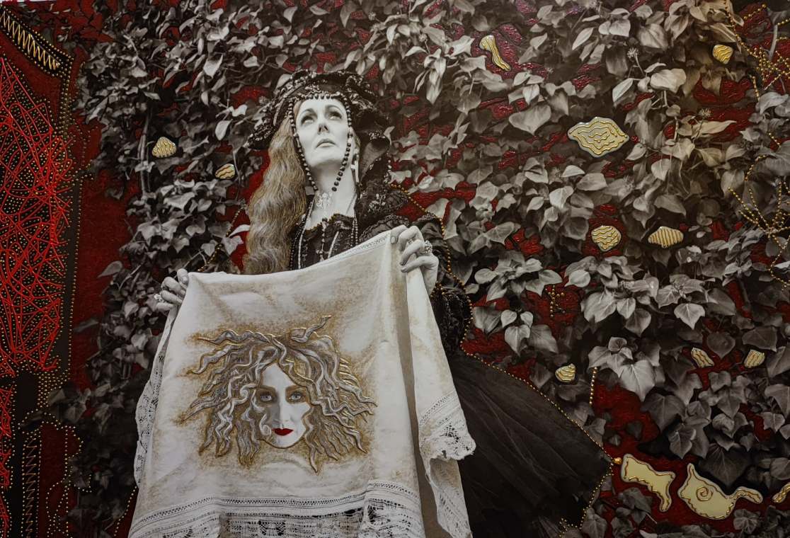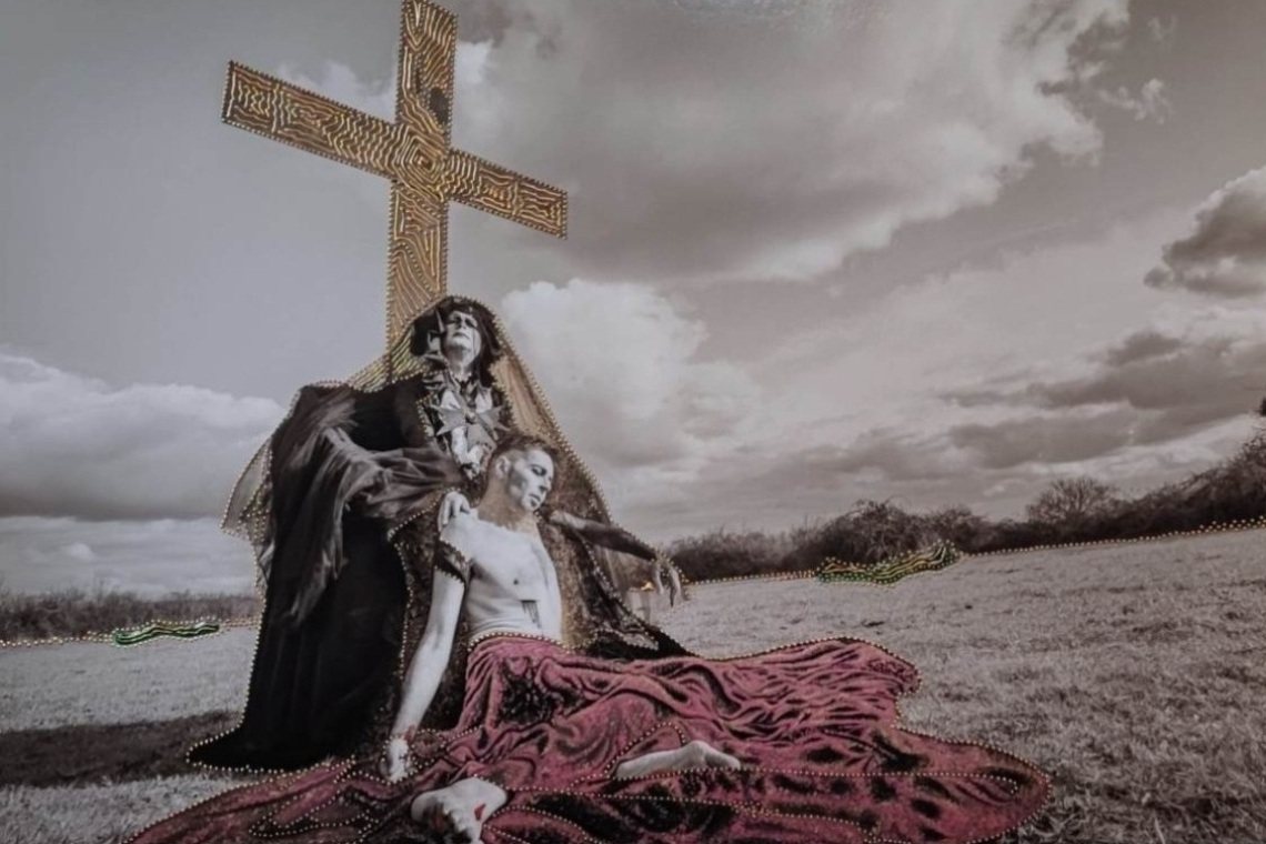 También surgen citas concretas a la pintura religiosa clásica, como es el caso de la fotografía tratada pictóricamente “El Yacente de Kiev”, inspirado en la pintura de Andrea de Mantegna “Lamentación sobre Cristo muerto” de 1478. Obra en la que subyace la crítica a la actual invasión rusa de Ucrania. Al igual ocurre con la impactante teatralidad de la imagen de la “Verónica con faz de María Magdalena”, que recuerda a “La Santa Faz” de Bartolomé Esteban Murillo. Más dramática y tensa es la composición de “Otra Piedad”, obra en la que se introduce una cita explícita al mundo gay, por medio del triángulo rosa que se observa en la base, distintivo con el que el nacismo alemán marcaba a los gays y sacrificaba en las cámaras de gas.