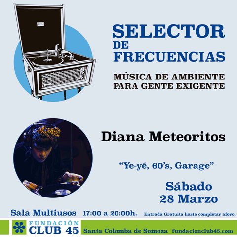 El ciclo Selector de Frecuencias contará el sábado 28 de marzo, con Diana Meteoritos, el cincuenta por ciento del dúo de Dj’s en femenino “Meteoritos y Vendavales”, famosas pinchadiscos de Ponferrada que han desplegado su colección de vinilos en fiestas garajeras y festivales de rocanrol por todo el norte de España. La sesión de Diana promete diversión yeyé y mucho garaje sixties.