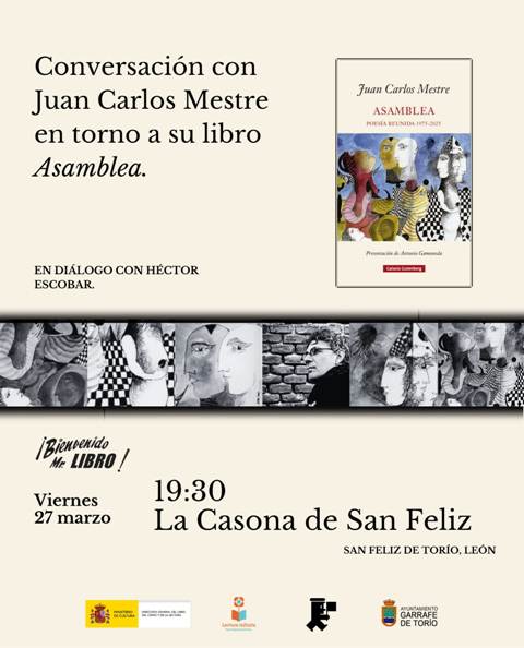 El poeta y artista visual Juan Carlos Mestre presenta este viernes 27 de marzo en LA CASONA de San Feliz de Torío su poesía reunida 1975-2025 titulada “Asamblea”, recientemente publicada por la editorial Galaxia Gutenberg. Un libro que recorre cincuenta años de escritura. La conversación con el escritor comenzará a las 19:30 horas.