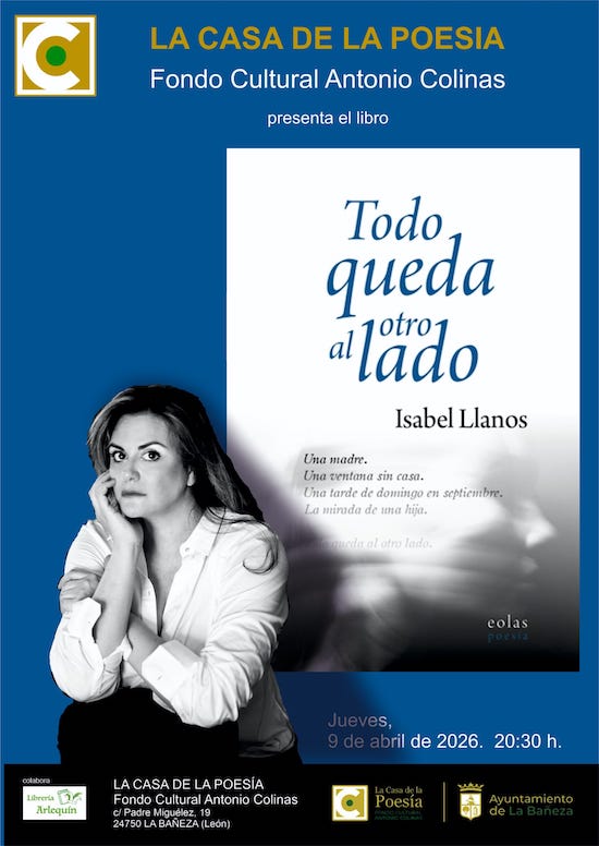 La Sala Región del Instituto Leonés de Cultura (ILC) acoge este miércoles 8 de abril, a las 19.30 horas, la presentación del poemario “Todo queda al otro lado” (Eolas Ediciones), de la actriz y poeta Isabel Llanos, quien estará acompañada por la periodista Ana Gaitero. Y al día siguiente, jueves 9 de abril, será Antonio Colinas quien la acompañe en la presentación que tendrá lugar en la Casa de la Poesía de La Bañeza.