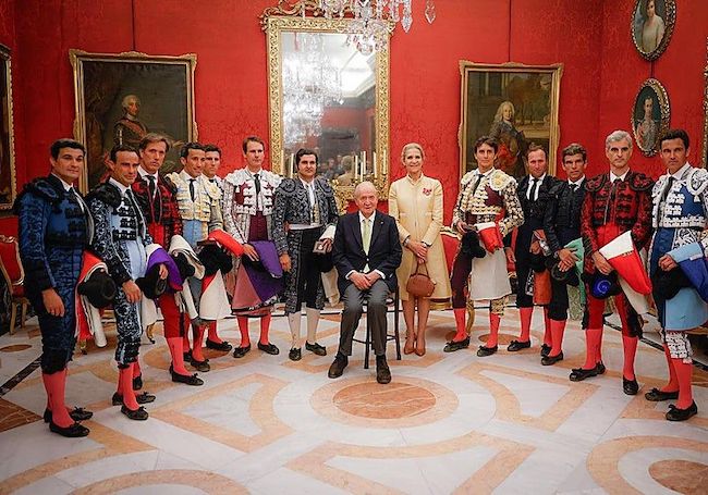 El pasado día 5, Juan Carlos I acudió a una corrida de toros en la plaza de La Maestranza, Sevilla. España, para más señas: desde unos 8000 km de su actual residencia personal y fiscal, vino a visitar a parte de su familia y ver cómo mataban unos animales en público. Como consecuencia de ello se tomó una fotografía peculiar, la que ven aquí. En ella, el rey emérito se sienta rodeado de su hija mayor, Elena, y una corte y cohorte de matadores de toros vestidos de distintos tonos cromáticos.