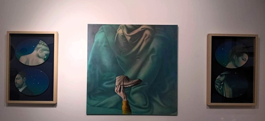 En esta ocasión, como en otras, la exposición incluye un tema recurrente en la producción del pintor: Amantes separados, que es un gran fado de Amalia Gaviria que lleva haciendo treinta años, pero de maneras distintas. “Aquí cuadran mucho, porque todo está muy entonado cromáticamente” asegura. Se puede ver a Xabi Alonso, cuando era joven e ingresó en el Real Madrid; las actrices Romy Schneider y Anita Ekberg, y el actor y director de cine italiano Giancarlo Giannini. “Este es un tema que yo hice desde siempre y que siempre lo hago de manera distinta en cada época de mi vida. Me atrae muchísimo, y lo detalla: “Ellos dos están en una ciudad distinta. Todos tienen un lunar. Mira a Anita Egbert, que tiene la serie de tres estrellas. Solo se ven dos. Esa es la constelación de Orión. Ellos están unidos por la carne en el cielo. Uno está en Berlín, otro está en Pompeya, pero en el cielo”.