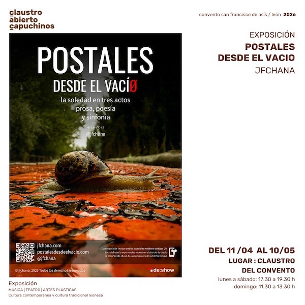 claustro abierto capuchinos, dentro de su programa dedicado a las artes plásticas, acoge hasta el 10 de mayo de 2026 la exposición «POSTALES DESDE EL VACÍO», del artista multidisciplinar bañezano JFChana (@jfchana). Se trata de una obra abierta y conceptual, estructurada en tres actos, que aborda la soledad desde una perspectiva contemporánea, y que permite múltiples lecturas en función de la experiencia personal de cada visitante. El horario del claustro, ubicado en el convento de San Francisco de Asis de León, es, de lunes a sábados: 17:30-19:30 horas, y domingos: 11:30-13:30h.