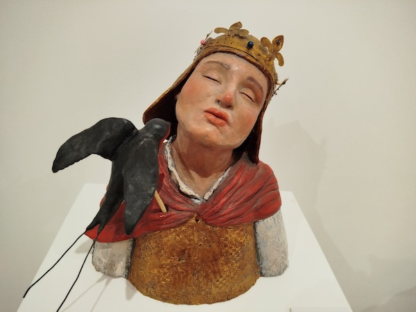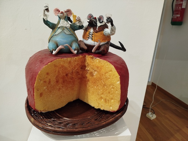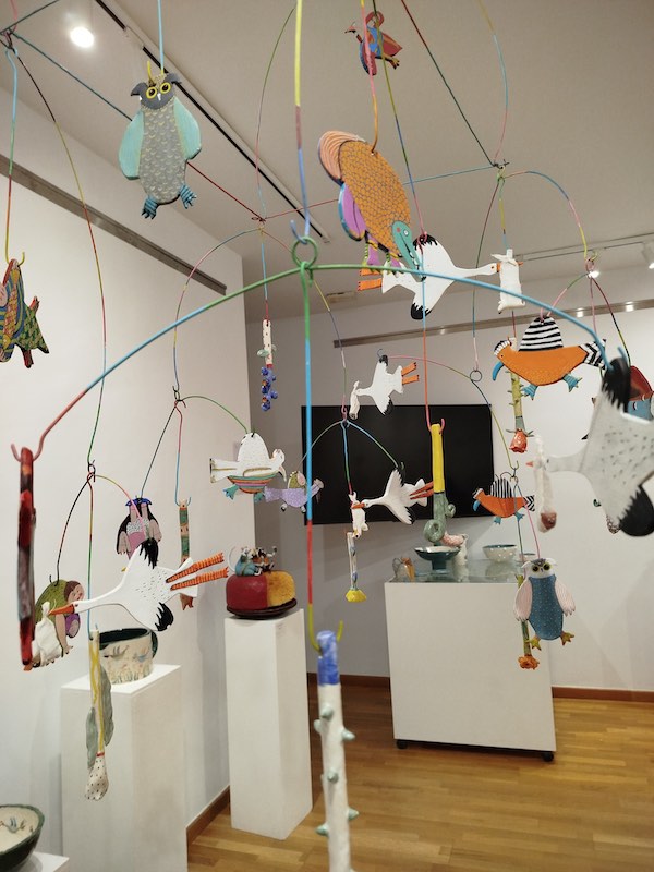 Un príncipe feliz, pájaros que revolotean por toda la sala, ratones de los cuentos tradicionales, una alta lámpara cargada de abubillas, platos y vasos de cerámica que podían estar en cualquier cocina o la diosa griega Pasifae forman parte de la muestra titulada “Barro”. Toda una apuesta artística nada convencional que se deja llevar por un camino “divertido” y “acorde con mi forma de ser”, asegura Sánchez-Girón Martín.