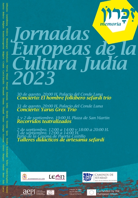 Las Jornadas Europeas de la Cultura Judía, que en este 2023 están dedicadas al concepto de “Memoria”, tendrán lugar entre el 30 de agosto y el 3 de septiembre. El programa de este año incluye conciertos, talleres y visitas teatralizadas por la aljama leonesa para poner en valor la riqueza e importancia histórica del judaísmo. Las actividades comienzan este miércoles, 30 de agosto, con el concierto de El hombre folkíbero sefardí trío, a las 20:00 horas, en el Palacio del Conde Luna. Todas son gratuitas hasta completar aforo.