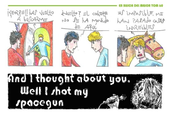 Tira 59 de “En busca del Major Tom”, del dibujante leonés Alberto D. Nogal. Una historieta gráfica de 28 páginas, ejecutada en técnica mixta con lápices de colores y ordenador, y concebida para la colección ArteBowie de Carlos Luxor. Cada semana publicamos una nueva tira, hasta 78 en total, de esta historia medio pop, medio naif, inspirada en el Major Tom, el personaje ficticio creado por David Bowie, en Space Odity, la mítica canción de 1969 en la que narra el viaje iniciático de este astronauta, rumbo a las estrellas.