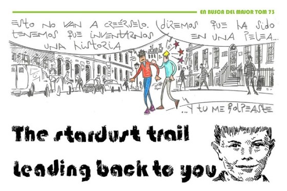 Tira 73 de “En busca del Major Tom”, del dibujante leonés Alberto D. Nogal. Una historieta gráfica de 28 páginas, ejecutada en técnica mixta con lápices de colores y ordenador, y concebida para la colección ArteBowie de Carlos Luxor. Cada semana publicamos una nueva tira, hasta 78 en total, de esta historia medio pop, medio naif, inspirada en el Major Tom, el personaje ficticio creado por David Bowie, en Space Odity, la mítica canción de 1969 en la que narra el viaje iniciático de este astronauta, rumbo a las estrellas.