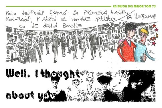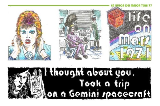 Tira 75 de “En busca del Major Tom”, del dibujante leonés Alberto D. Nogal. Una historieta gráfica de 28 páginas, ejecutada en técnica mixta con lápices de colores y ordenador, y concebida para la colección ArteBowie de Carlos Luxor. Cada semana publicamos una nueva tira, hasta 78 en total, de esta historia medio pop, medio naif, inspirada en el Major Tom, el personaje ficticio creado por David Bowie, en Space Odity, la mítica canción de 1969 en la que narra el viaje iniciático de este astronauta, rumbo a las estrellas.